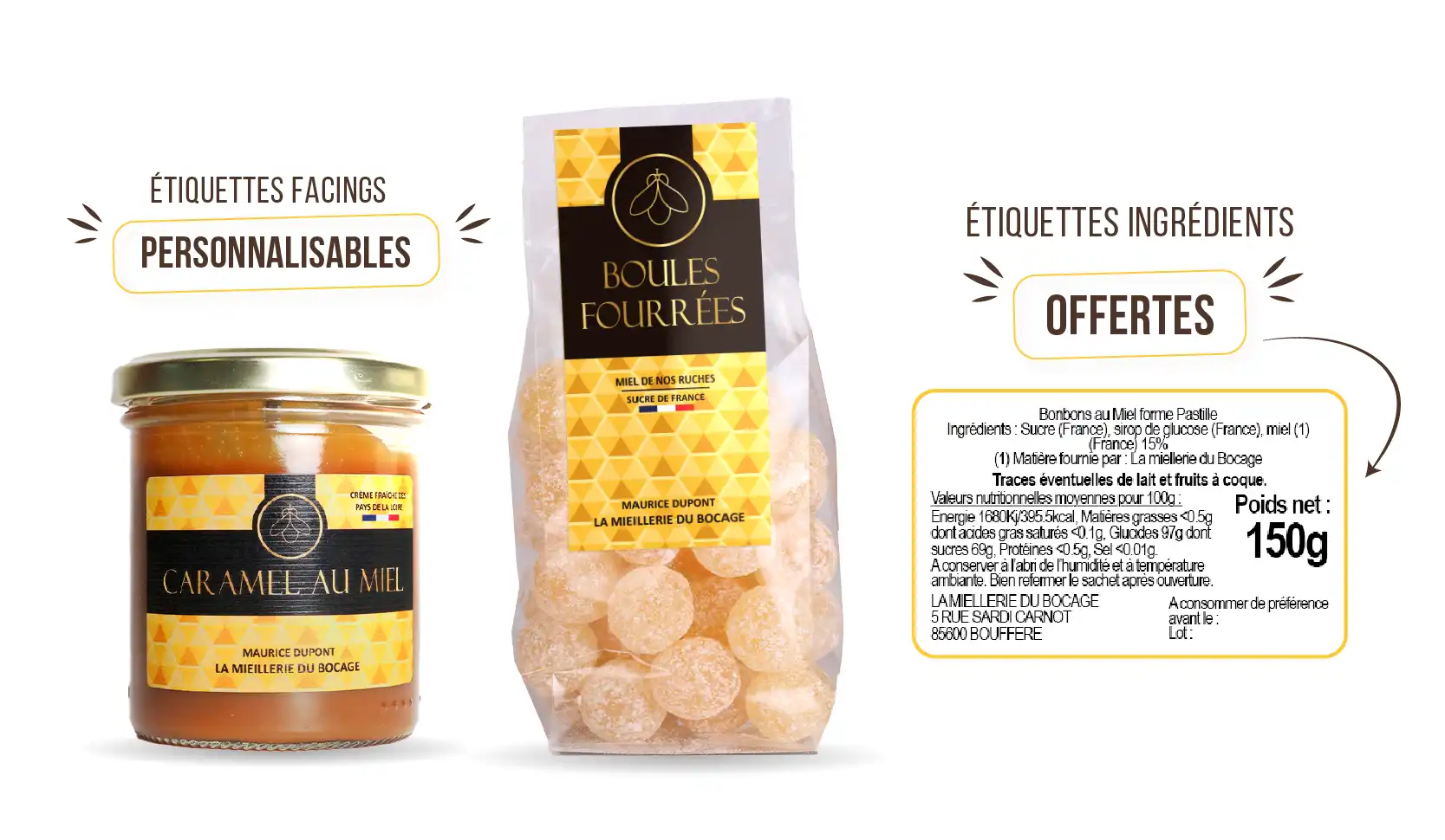 Notre équipe vous accompagne à chaque étape, que nous réalisons en y apportant le plus grand soin. Réactivité, rigueur et savoir-faire vous assurent une fabrication de bonbons au miel à façon de qualité.